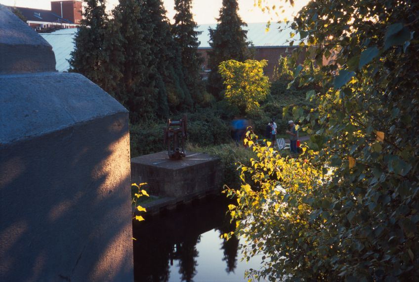 The view down from the other side of the bridge, onto some ancient piece of canal related machinery. The Woking Borough Council tourist department obviously think this is "a feature". |